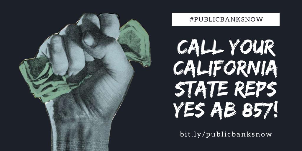 #California. California Assembly Bill 857 is a way for local municipalities and towns to make their own bank. I happen to have your California State assembly-person's number available to you, too!