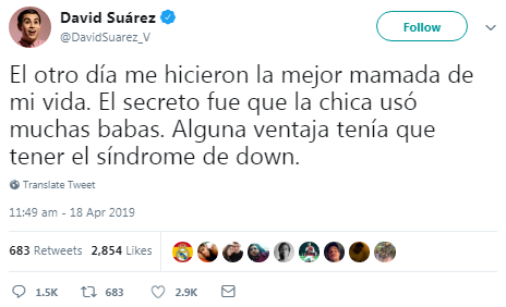 @ukhomeoffice Why let@DavidSuarez_V from#Spain into the#UK? He mocks people with#DownSyndrome,says he had the best "blow job" in his life because the DS girl dribbled so much,adding,"There had to be some advantage of having DS".[TR.]#HateCrime SEE: https://twitter.com/DavidSuarez_V/status/1118813887011393541 …pic.twitter.com/c5qhxKs50gОвај медиј може да садржи осетљиви материјал. Сазнај више