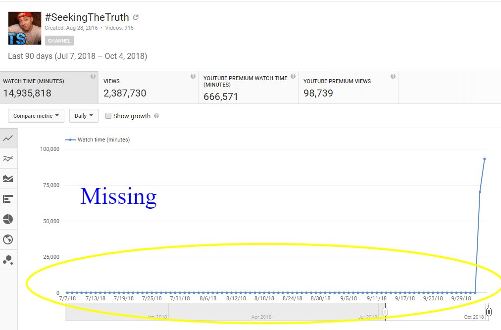 @TeamYouTube My account Analytic data is missing and now shows I do not have enough watch hours which is not correct because I have millions of watch hours in the past 12 months. Channel https://www.youtube.com/seekingthetruth101 …pic.twitter.com/CAo7uvwPMr