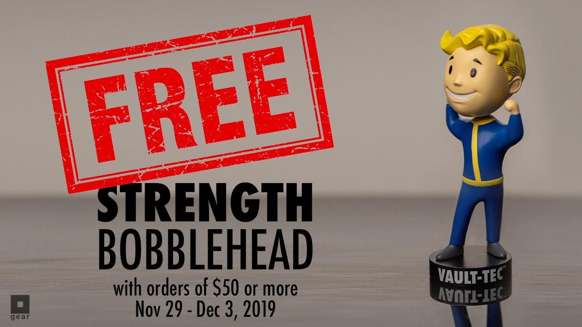 Place an order for $50 or more in Bethesda Gear product Nov 29 through Dec 3, 2019 and add a @Fallout Strength Bobblehead to your cart for free!