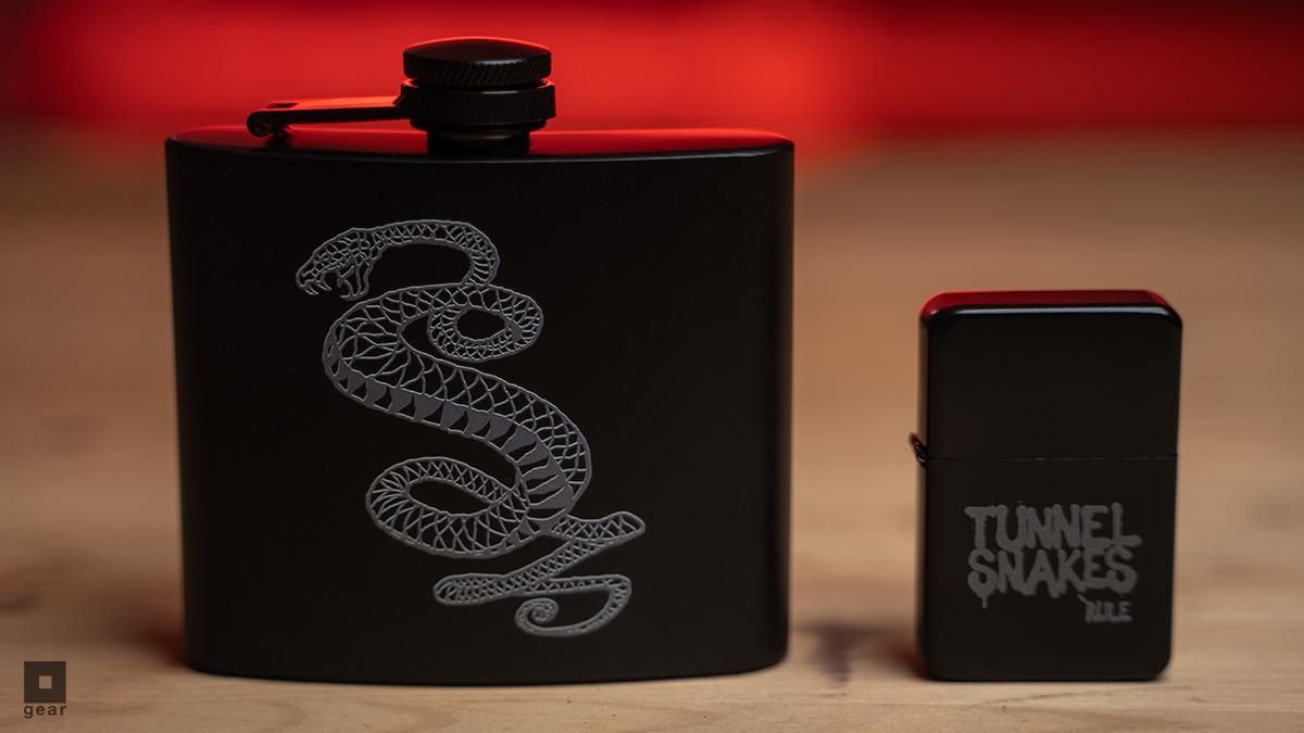 The Tunnel Snakes might not have had access to this @Fallout Tunnel Snakes Rule Flask & Lighter Set, but you do. Both the flask and lighter feature a matte black finish with silk-screened graphics.