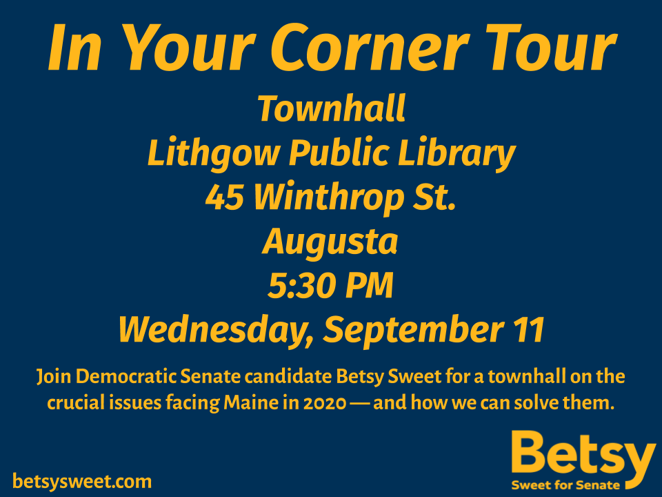Change of plans: the Augusta stop on the #InYourCornerTour will be at Lithgow Public Library, not Augusta City Hall as previously scheduled. The Lithgow Public Library is at 45 Winthrop St. The event will still be held at 5:30 PM on Sept. 11. #mepoliticspic.twitter.com/dUy522YOWP