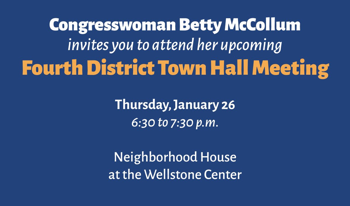 REMINDER: Join me for my next town hall meeting this Thursday, Jan. 26 at 6:30 p.m. @NeighbHouseMN. Learn more → http://mccollum.house.gov/jan26-town-hall pic.twitter.com/YdtOVqkh37