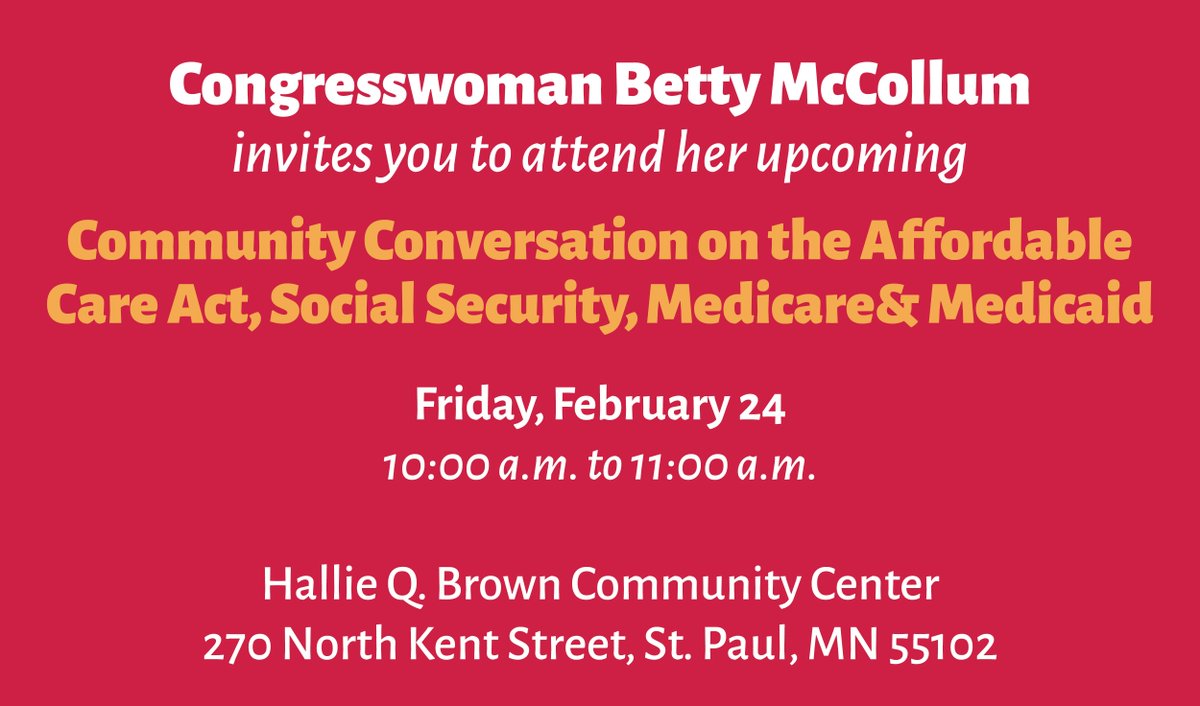 I’m hosting a conversation on #ACA, Social Security, Medicare & Medicaid @HallieQBrownCtr on Feb. 24. Join us: http://mccollum.house.gov/feb24-conversation …!pic.twitter.com/nKod7GEXcV