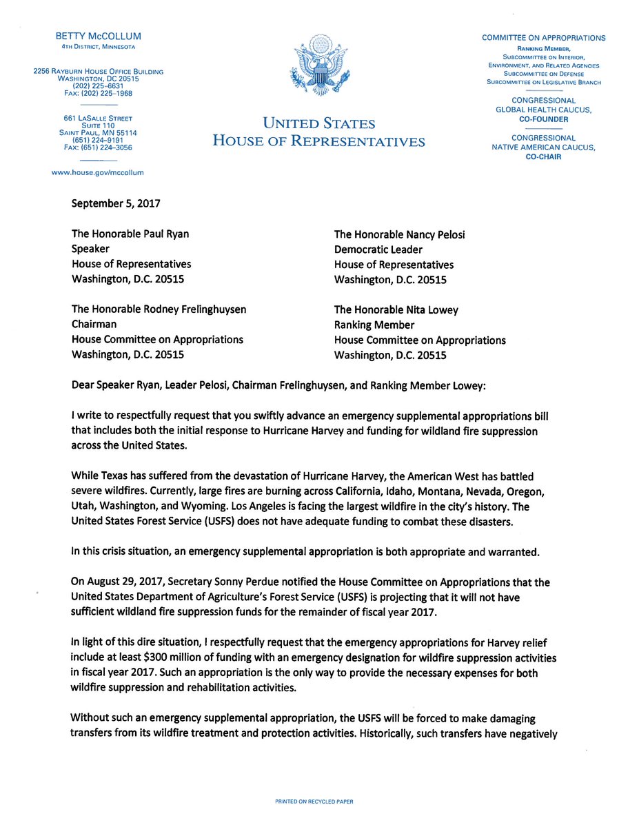 I wrote to House leaders today urging $300 million for emergency wildfire suppression be included in the supplemental for Harvey relief.pic.twitter.com/GOSK0Iidgs