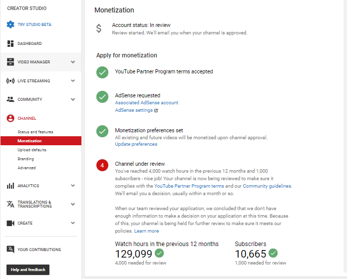 @TeamYouTube I currently have 130,611 watch hours and 10,665 subscribers. I worked so hard to get my channel approved with all these original content yet I am still not monetized and it really hurts...my channel link--https://www.youtube.com/channel/UCMgOxihHK_r_us9Fc80UDaA …pic.twitter.com/dx4eWxXmXL