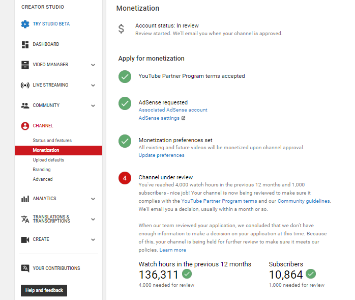 @TeamYouTube I currently have136,311 watch hours and 10,864 subscribers. I worked so hard to get my channel approved with all these original content yet I am still not monetized and it really hurts...my channel link--https://www.youtube.com/channel/UCMgOxihHK_r_us9Fc80UDaA …pic.twitter.com/kTq4nFgJEu