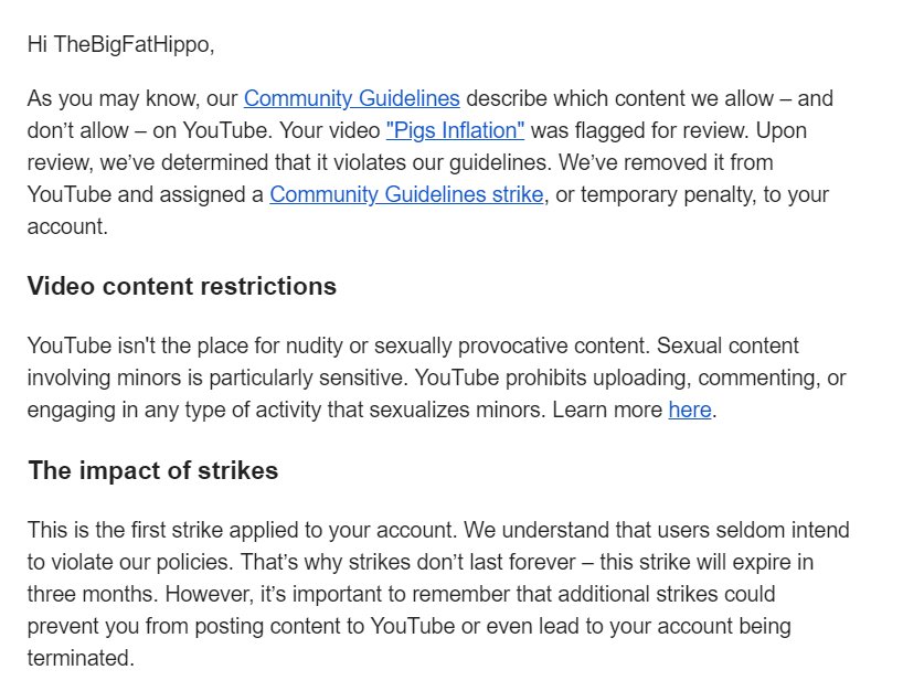 @TeamYouTube I am so lost and frustrated, my channel is TheBigFatHippo on YT, and somehow one of my videos got taken down because I "violated" the community guidelines because the video was "sexual" Please look at the video and fix this problem because I'm not happy about it.pic.twitter.com/443EzmA4bV