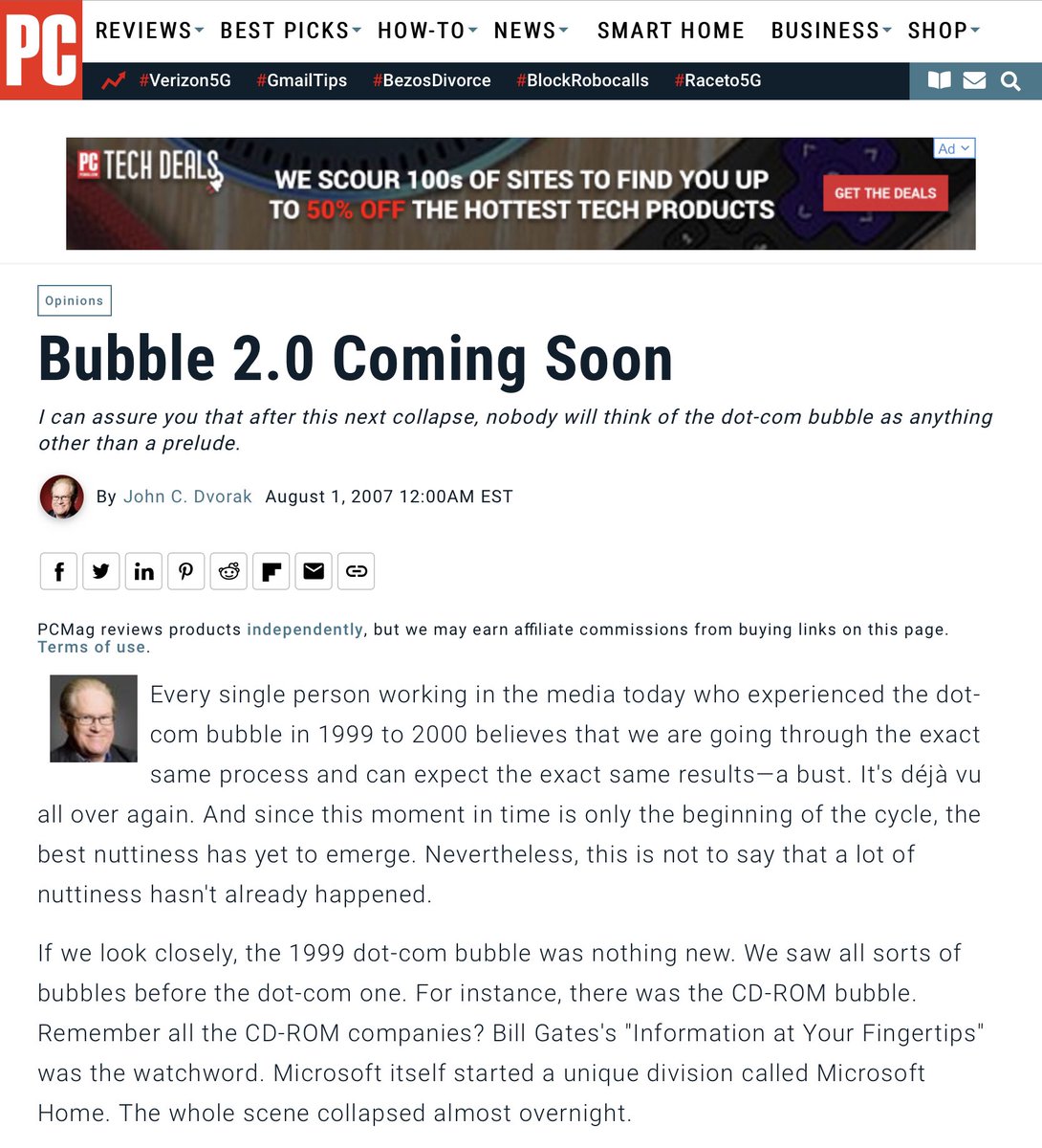 This is the year we celebrate (at least) the 15th birthday of the declaration of Bubble 2.0. https://redeye.firstround.com/2007/10/this-year-i-mea.html … here’s a personal fav that I won’t link to because PC Mag now sadly seems to redirect to spam?! pic.twitter.com/PNezElAuR7