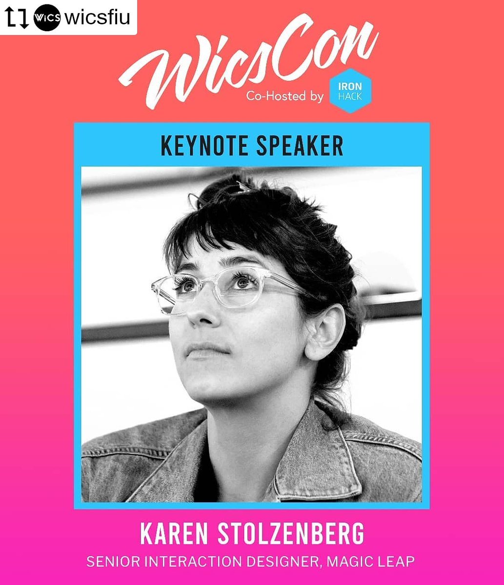 @wicsfiu #wicscon keynote speaker tomorrow Karen Stolzenberg designs experiences for the virtual and t spatial communications platform. Karen can be found on twitter @kroncorde. #womenincomputerscience #femaletechnologist #wicscon #magicleap #fiuscis #fiucec pic.twitter.com/WAHMwMIsw9