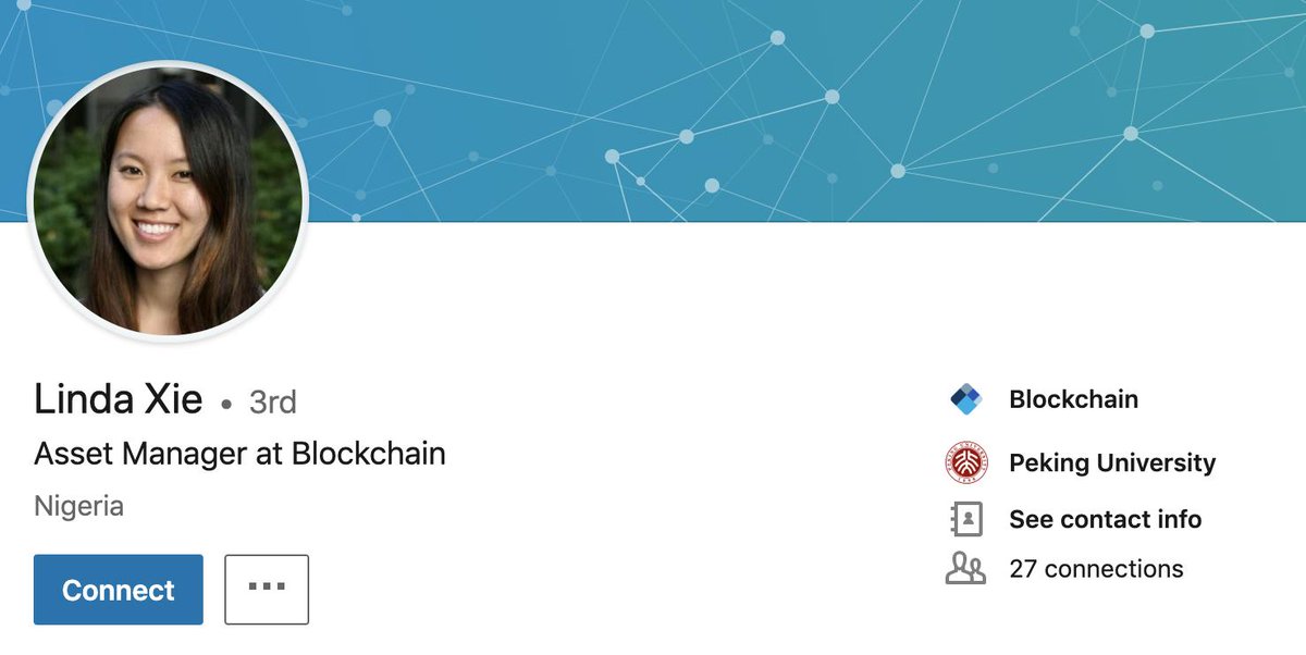 There's a fake LinkedIn profile of me going around adding people so please be careful. This Linda is an asset manager at blockchain based in Nigeria and went to Peking University so she's a cooler version of me. pic.twitter.com/d6DXdqlxZv
