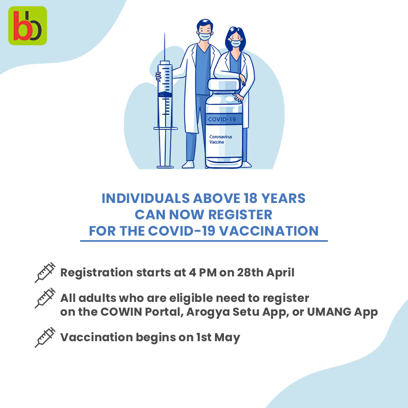 #CovidVaccine for adults above the age of 18 begins today. You can register on http://cowin.gov.in , Arogya Setu App, or UMANG App to be able to take the vaccine on 1st May. We urge you to do your bit and take the vaccination.pic.twitter.com/IpHZxtVFRC