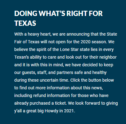 agreed. we had considered making the trip down in the fall because we've missed it the last 3 years, but even IF it weren't cancelled, the current state of things is a big nope - State Fair of Texas is amazing, but it ain't worth dying for