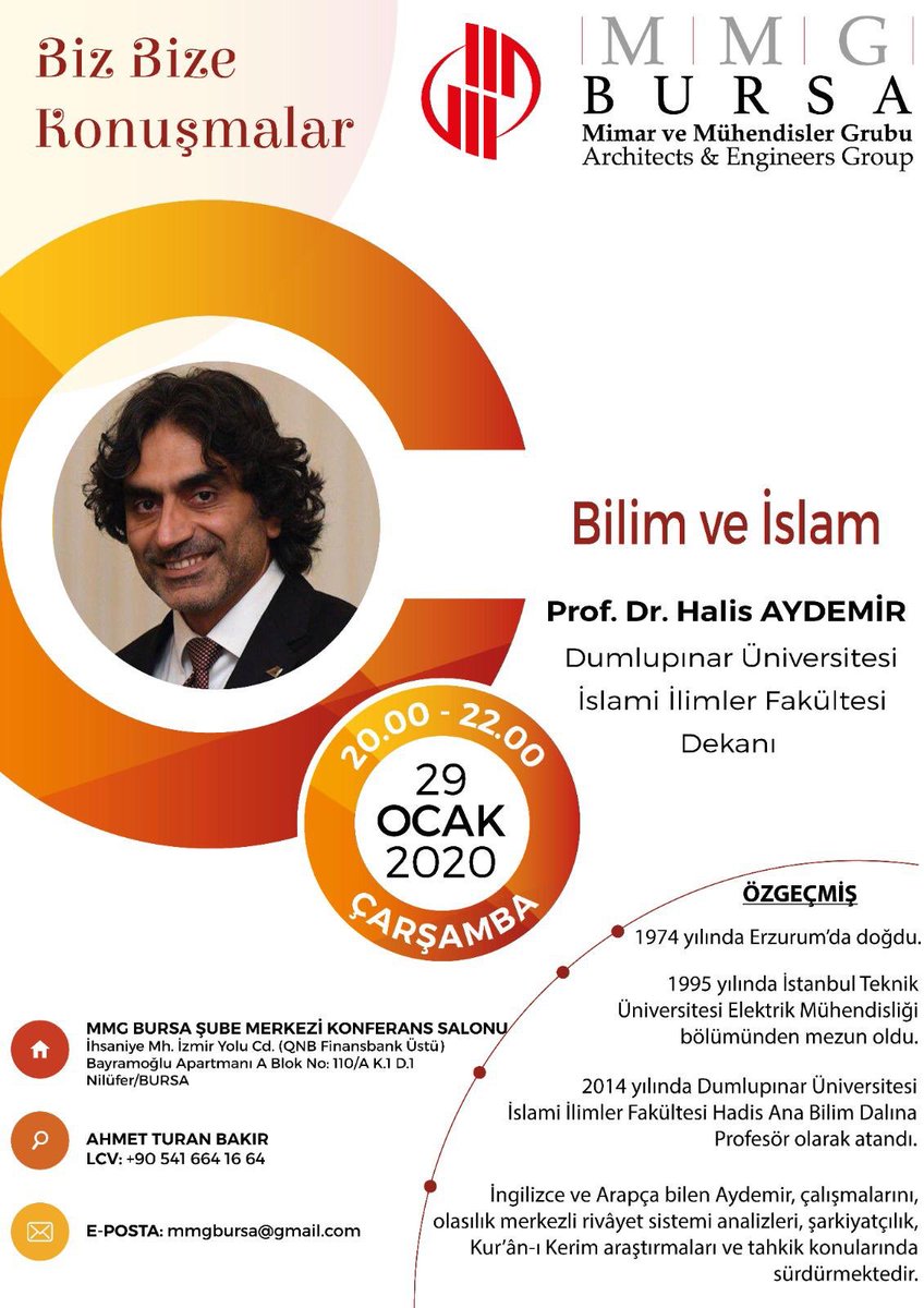 29 Ocak 2020 Çarşamba Günü Saat 20.00'de düzenlenecek olan "Biz Bize Konuşmalar" programımıza, Kütahya Dumlupınar Üniversitesi İslami İlimler Fakültesi Dekanı Prof. Dr. Halis AYDEMİR katılarak "Bilim ve İslam" konulu bir sunum gerçekleştirecektir. KATILIMLARINIZI BEKLERİZ.pic.twitter.com/5pbbIaQpdY