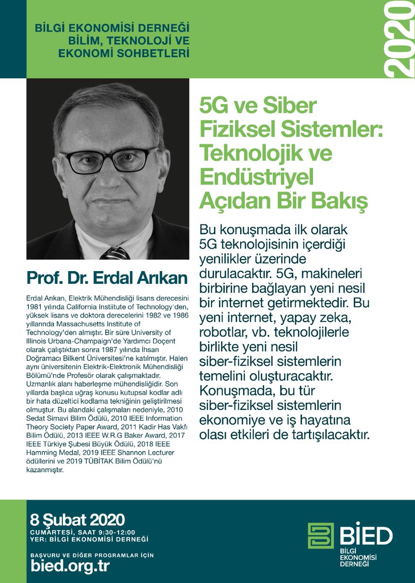 Bilim, Teknoloji ve Ekonomi Sohbetleri kaldığı yerden devam ediyor! Dönemin ilk konuşmacısı Bilkent Üniversitesinden 5G'de Kullanılan Polar Codes Mucidi Prof. Dr. Erdal Arıkan"5G ve Siber Fiziksel Sistemler:Teknolojik ve Endüstriyel Açıdan Bir Bakış"konusuyla bizlerle olacaktır.pic.twitter.com/7JXW30Tr2g