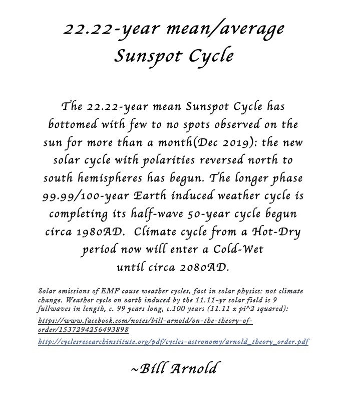 Solar emissions of EMF cause weather cycles, fact in solar physics: not climate change. Weather cycle on earth induced by the 11.11-yr solar field is 9 fullwaves in length, c. 99 years long, c.100 years (11.11 x pi^2 squared): https://www.facebook.com/notes/bill-arnold/on-the-theory-of-order/1537294256493898 … http://cyclesresearchinstitute.org/pdf/cycles-astronomy/arnold_theory_order.pdf …pic.twitter.com/fXk6kLCZJC