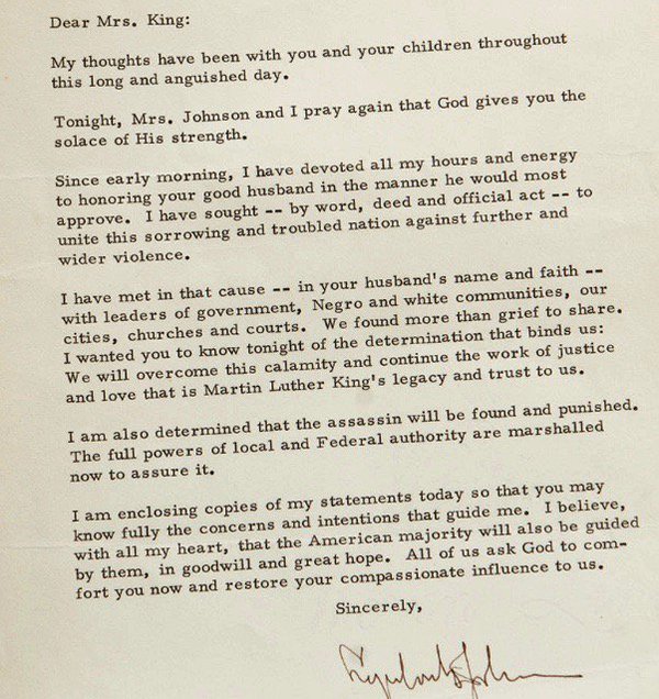LBJ writes widowed Coretta Scott King after her husband’s assassination, 50 years ago:pic.twitter.com/7lKsbwoOSl