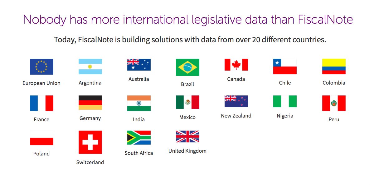 As FiscalNote continues its goal to create the world's first centralized repository of all of humanity's laws and regulations on every country on the planet, take a look at some of the countries we cover today! Excited to continue our growth around the world.pic.twitter.com/cLvSJxGt0N