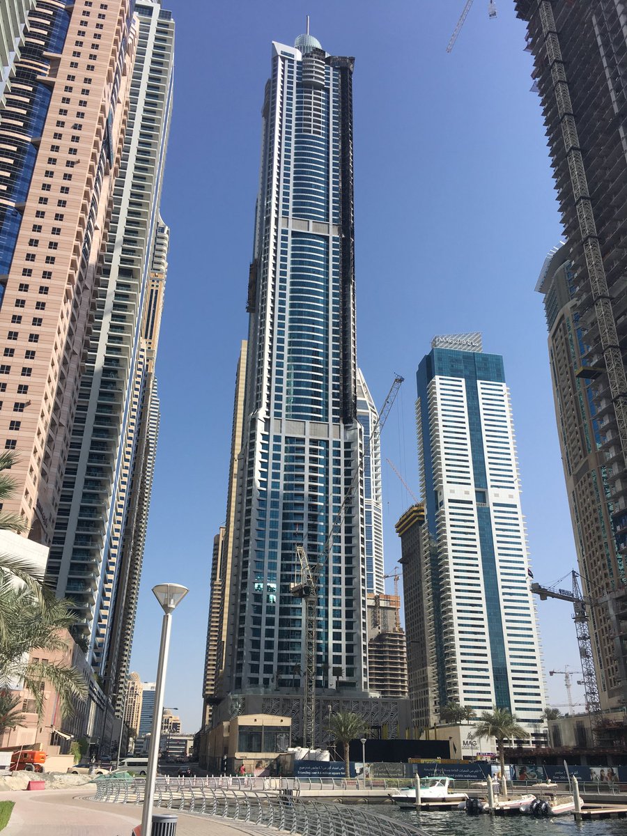 The Torch Tower (352m) Dubai marina, still burnt out up the corner. Fire in such buildings a terrifying prospect, now under global scrutiny.