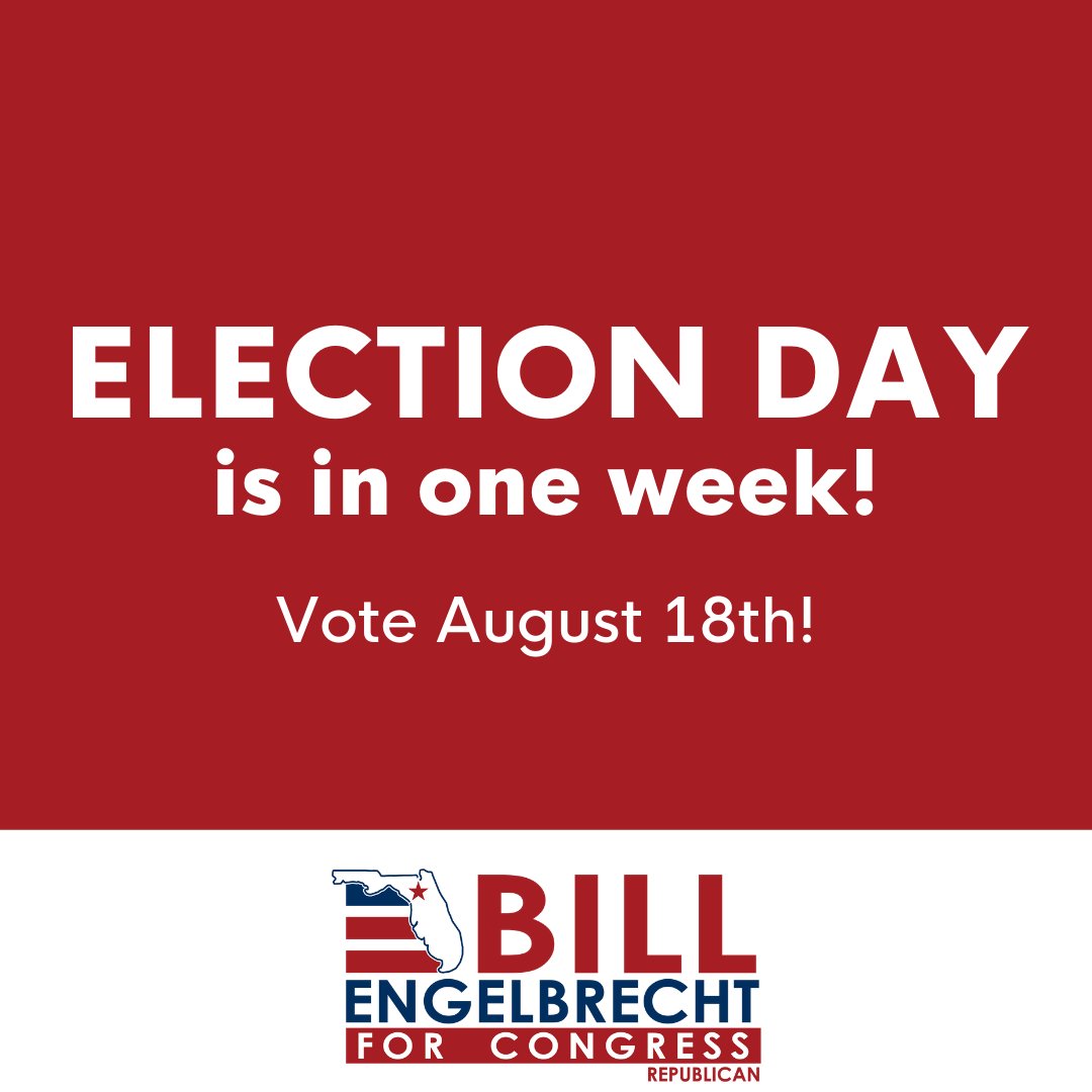 Election Day is one week away! I'd be honored to have your vote and support. Vote Bill Engelbrecht, an Everyday American Conservative Republican, for Congressional District 3! #FL3pic.twitter.com/PgWpNWsd6d