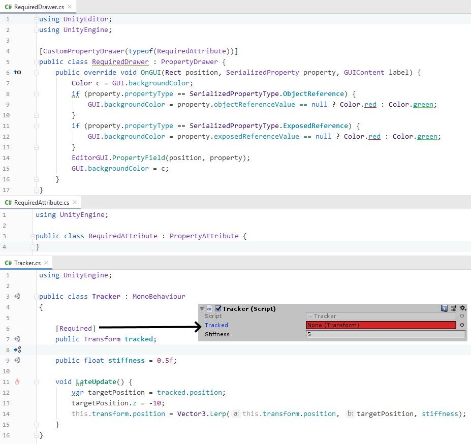 The code in the gif is a custom instepctor for the class UnityTip which has a public member GameObject WithOutThisItBreaks. To not have it double in the inspector we gave it the Tag [HideInInspector]. This is the variable we used to demonstrate the idea.