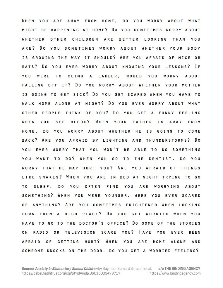 #Markup excerpt, featuring questions from the Generalized Anxiety Scale for Children. Grab a printable PDF at https://www.bindingagency.com/blog/markups/anxiety-in-elementary-school-children-by-seymour-bernard-sarason/ …#arts#poetry#amwriting#worksheetpic.twitter.com/6jmH35raKJ