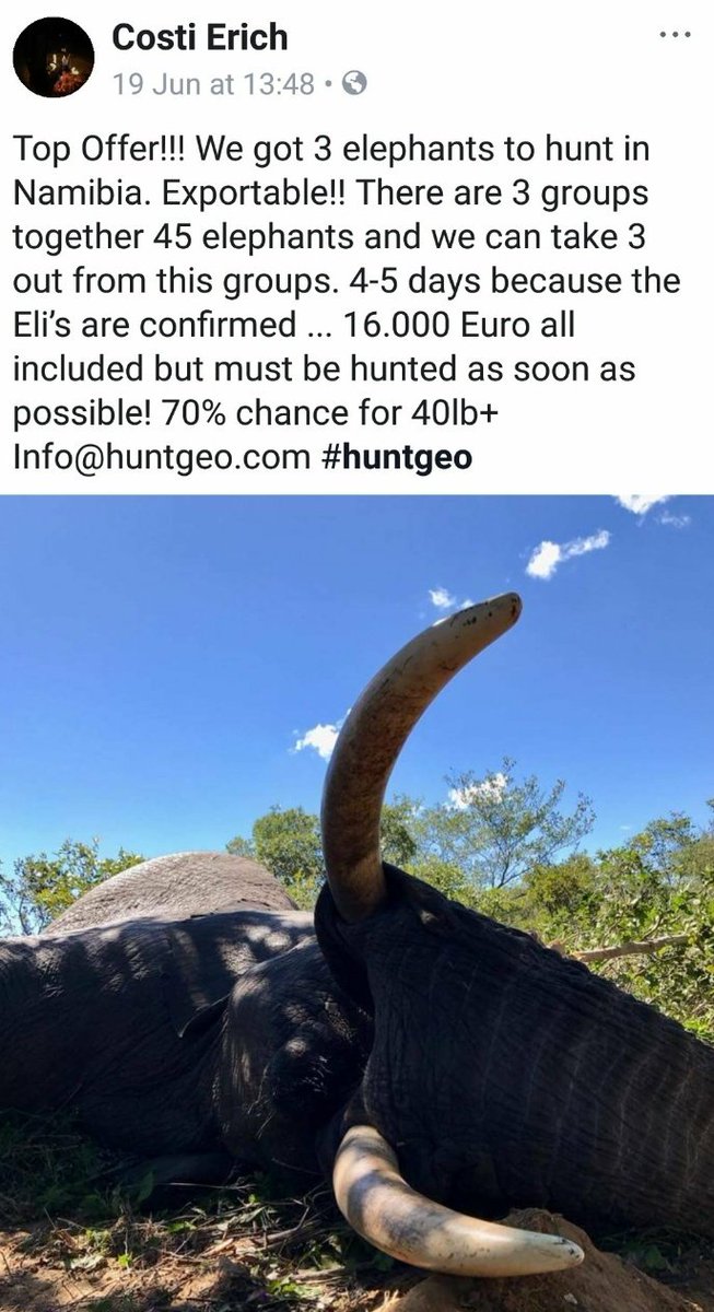 #HuntGeo wants you to hurry up to join in the slaughter of 3#elephants in#Namibia. Limited time offer. He's already arranged getting the trophies into the US. He left his email. Very Politely (no threats) tell him what you think. RT and Sharepic.twitter.com/quFlpBBWcJDeze media bevatten mogelijk gevoelig materiaal. Meer informatie