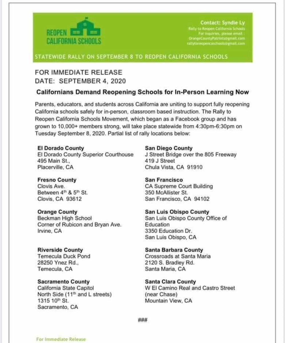 📢 CALL TO ACTION!!!! 📢 Like, share, repost & show up to support fully reopening schools in California!!! Distance Learning is NOT an education, our children deserve better. Im speaking at the Sacramento location. Hope to see you there!! Wear green if you can! @BishForCongresspic.twitter.com/cIaKoyLgpz