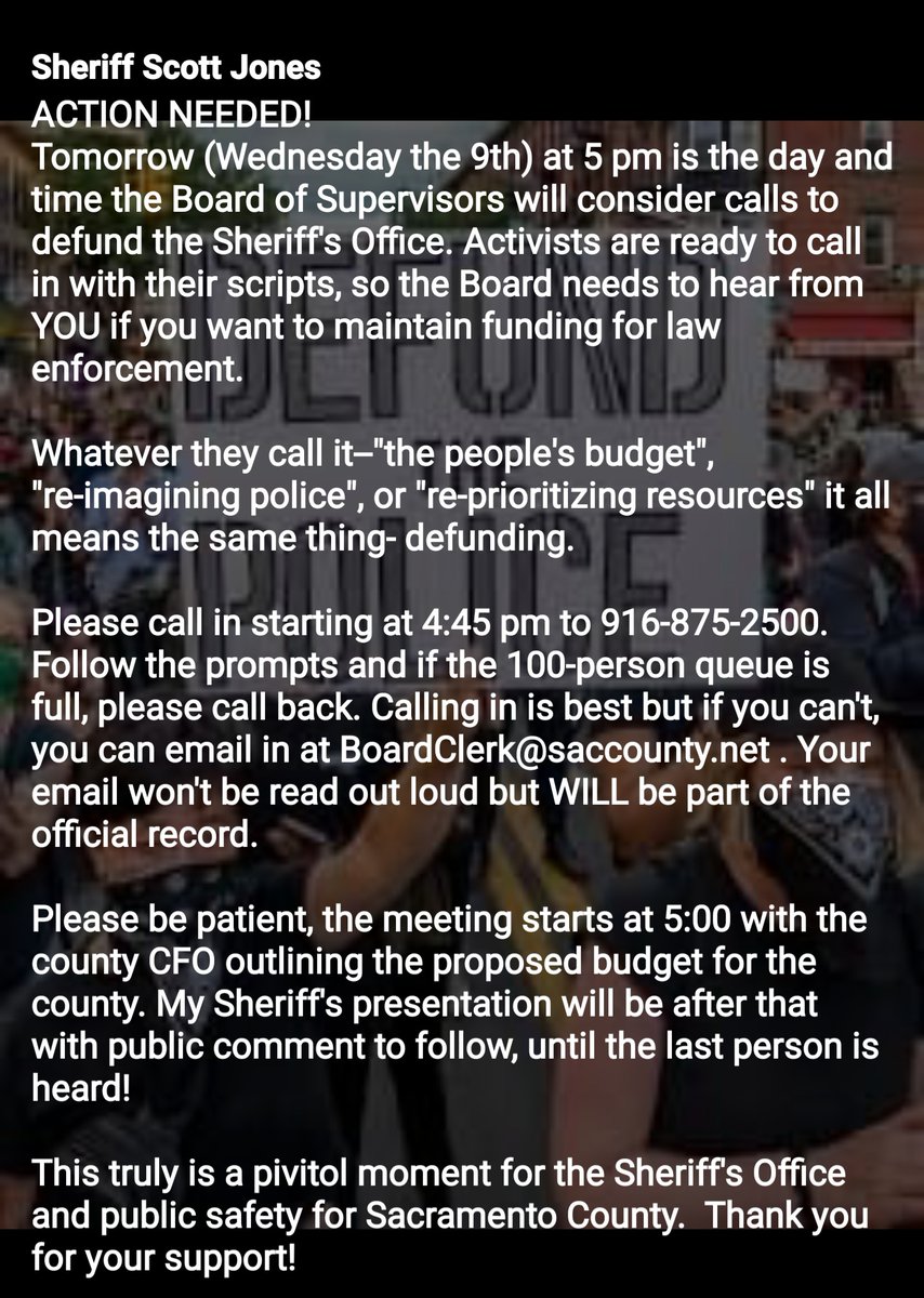 It might be interesting to see all the Sacramento politicians without police protection. But somehow, no matter how much they decimate LE, I have a feeling they will carve out protection for themselves at our expense. God bless & help the Sheriff.
