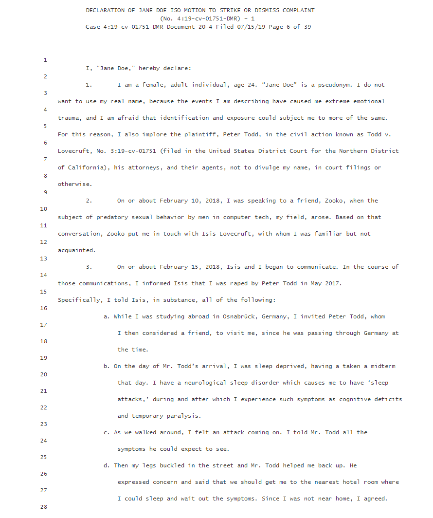 Reading the anonymous woman's testimony, I wonder why Peter Todd decided to sue Isis Lovecruft for defamation.pic.twitter.com/QHgiYvDkKo