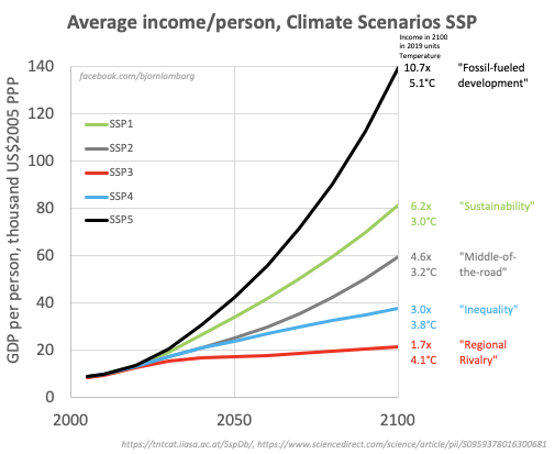 samtidig vil indkomstene i u-landene vokse langt, langt mere (ifgl IPCCs scenarier). I OECD vil indkomsten stige x5 per person, i u-landene 23x https://tntcat.iiasa.ac.at/SspDb/ pic.twitter.com/y3X17ztGNb