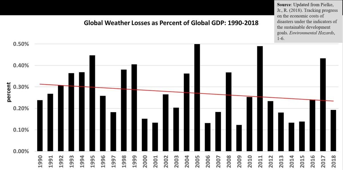 This influential academic is claiming (and insists claiming, even after being shown wrong) that climate damages from weather are increasing When adjusting for GDP (same storm/flood hitting a neighborhood with two houses instead of a shack will increase costs), it declineshttps://twitter.com/PeterGleick/status/1108412190866849792 …