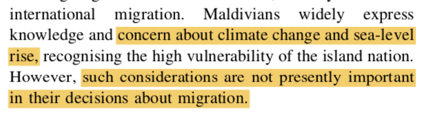 And although I don't know of any studies of the migration intentions of people from Marshall Islands, we have a study on the migration intentions from Maldives, and climate/sea level is "not presently important" https://link.springer.com/article/10.1007/s11625-016-0410-4 …pic.twitter.com/2qjdYBQPgb
