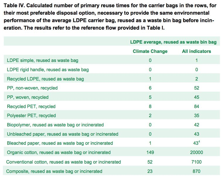 You must reuse an organic cotton shopping bag 20,000 times before it will have less climate damage than a plastic bag.https://www.theglobeandmail.com/opinion/article-sorry-banning-plastic-bags-wont-save-our-planet/ …