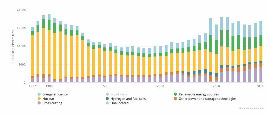 The world promised to double its green energy R&D from 2015-2020 Sadly, no sign of this happening (2015 at $16bn, 2018 at $17bn) https://www.iea.org/statistics/rdd/ pic.twitter.com/cLhbHoNITH