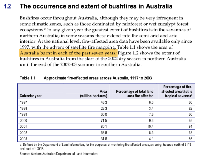 Here is another data point from 2002-3 from the National Inquiry on Bushfire Mitigation and Management, showing that bushfires routinely burn 3-10% of the Australian area each year (p5) https://www.dfes.wa.gov.au/publications/GeneralReports/FESA_Report-NationalInquiryonBushfireMitigationandManagement.pdf …pic.twitter.com/vA4RxMa0Hc