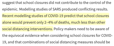 It does say "Recent modelling studies of COVID-19 predict that school closures alone would prevent only 2–4% of deaths, much less than other social distancing interventions." So to clarify, that is what I use to suggest school closures not very effectivepic.twitter.com/RMFWseLhPt