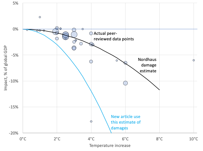 Alle de klimaskeptiske meningsdannere som Lomborg og CEPOS har flittigt brugt Nordhaus beregninger til at stoppe klimafremskridt. Vi andre har altid vidst at de var forkert på den (det vidste de nok også selv). Nu er der også en forskningsartikel der siger det