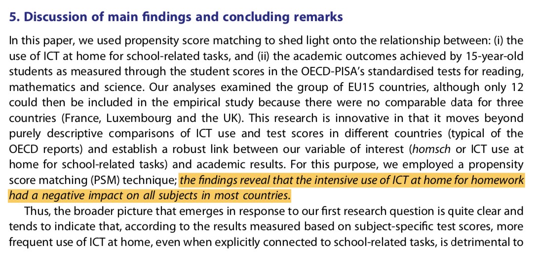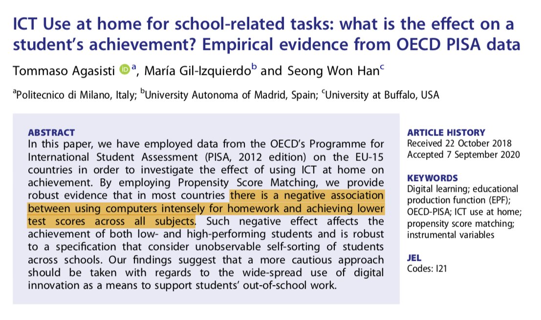 Intense use of computers for homework is associated with lower performance on all subjects, for low- and high-performing students alike. Analysis of PISA 2012 data.https://www.tandfonline.com/doi/abs/10.1080/09645292.2020.1822787 …