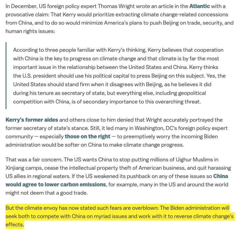 Others pointed out that of course there would be a tradeoff: if the US wanted more climate promises, it would have to scale back on its criticisms Kerry said absolutely no And now, so did China https://www.vox.com/2021/1/27/22252649/john-kerry-climate-change-china …pic.twitter.com/dgT2mkdT8Y