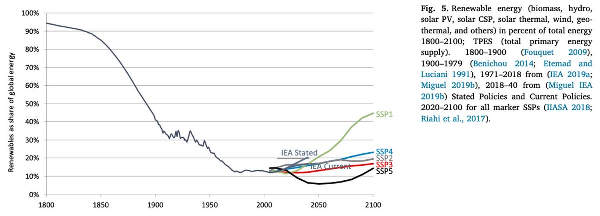 The share of renewables has been decreasing over the last 200 years, as we found better alternatives to wood. Renewable share will only slightly moderately over the next 80 years. From my 2020 peer-reviewed article: https://www.sciencedirect.com/science/article/pii/S0040162520304157 …pic.twitter.com/Par167USkv