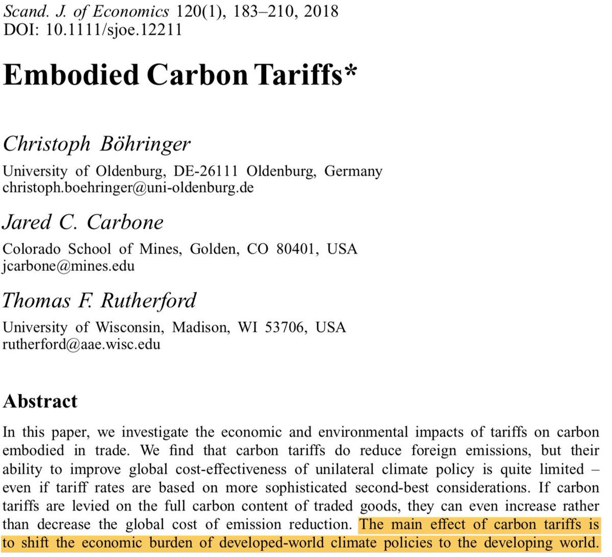 Worth realizing that net effect of carbon tariff shifts "economic burden of developed-world climate policies to the developing world" Forces businesses to move back to the rich world (+$90bn), and leave all cost ($500bn) to dev'ing world https://onlinelibrary.wiley.com/doi/abs/10.1111/sjoe.12211 …pic.twitter.com/QtPxX51WOI