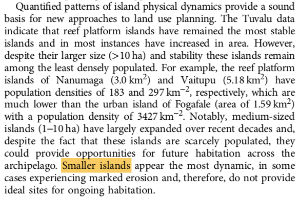 When you quote 'smaller islands', these are <1ha You're wrong by more than 100x. People live on much bigger islands: Fogafale is 159ha, Nanumaga 300ha and Vaitupu 518ha All have seen their area 𝗶𝗻𝗰𝗿𝗲𝗮𝘀𝗲, and this is 80% of total population https://www.nature.com/articles/s41467-018-02954-1 …pic.twitter.com/hf3pbzsb0V