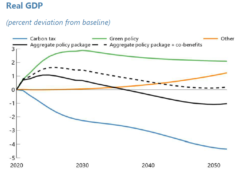 Should countries use revenue from a carbon tax to pay down debt (blue) or invest in a renewable future (green)? If combined with transfers to households (orange) & other co-benefits, the net effect of climate mitigation on GDP is positive! https://www.imf.org/external/np/g20/pdf/2021/062221.pdf …pic.twitter.com/NwoOYnBKRc