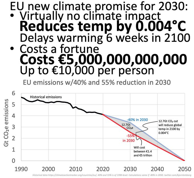EU wants to radically change itself to reduce emissions 55% by 2030 Extra cost upwards of €10,000 per EU citizen (€5tr) It will reduce global temps by 0.004°C (0.007°F) Let's not be surprised when the rest of the world doesn't follow https://www.euractiv.com/section/climate-environment/opinion/eu-must-get-smarter-to-lead-on-climate-change/ …pic.twitter.com/sDwRdPEe5L