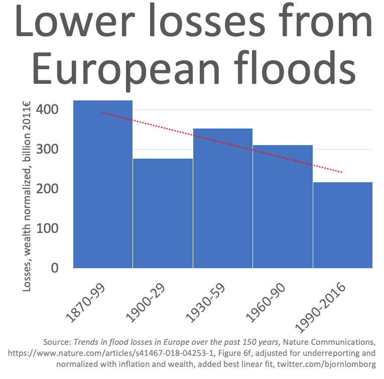 Despite breathless climate reporting, not only are European floods causing fewer deaths (tweet above) but Losses from floods in Europe are declining, not increasing https://www.nature.com/articles/s41467-018-04253-1 …pic.twitter.com/zH1eq7qCFJ