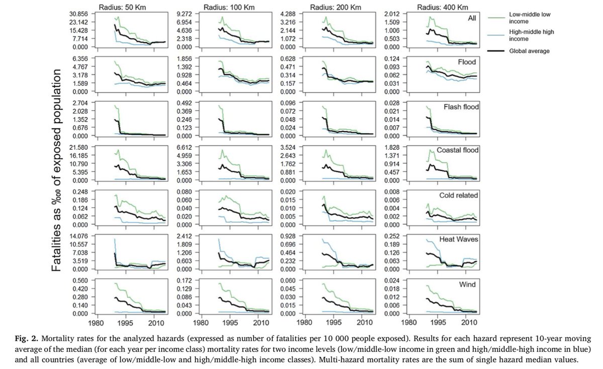 Flood costs are declining (2nd row), not only for rich countries but for developing countries Costs are declining for almost all extreme weather for rich and poor for flood, flash flood, coastal flood, cold and drought and for all extreme weather https://www.sciencedirect.com/science/article/pii/S0959378019300378 …pic.twitter.com/SSDB60YiV3
