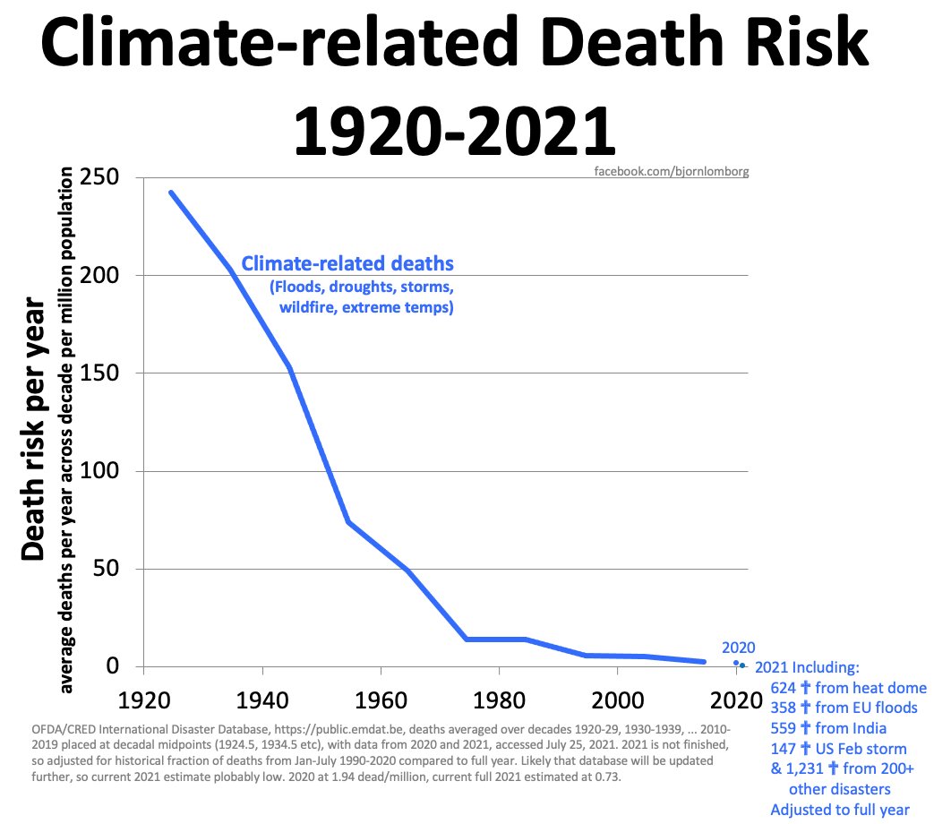 Ever-fewer people die from climate-related disasters — also in 2021 Climate-related deaths have dropped 96-98% over the past century Breathless climate reporting misleads us and panic makes us less likely to tackle climate smartly https://www.facebook.com/bjornlomborg/posts/374647437353599 …pic.twitter.com/9O8HVe5Rt4