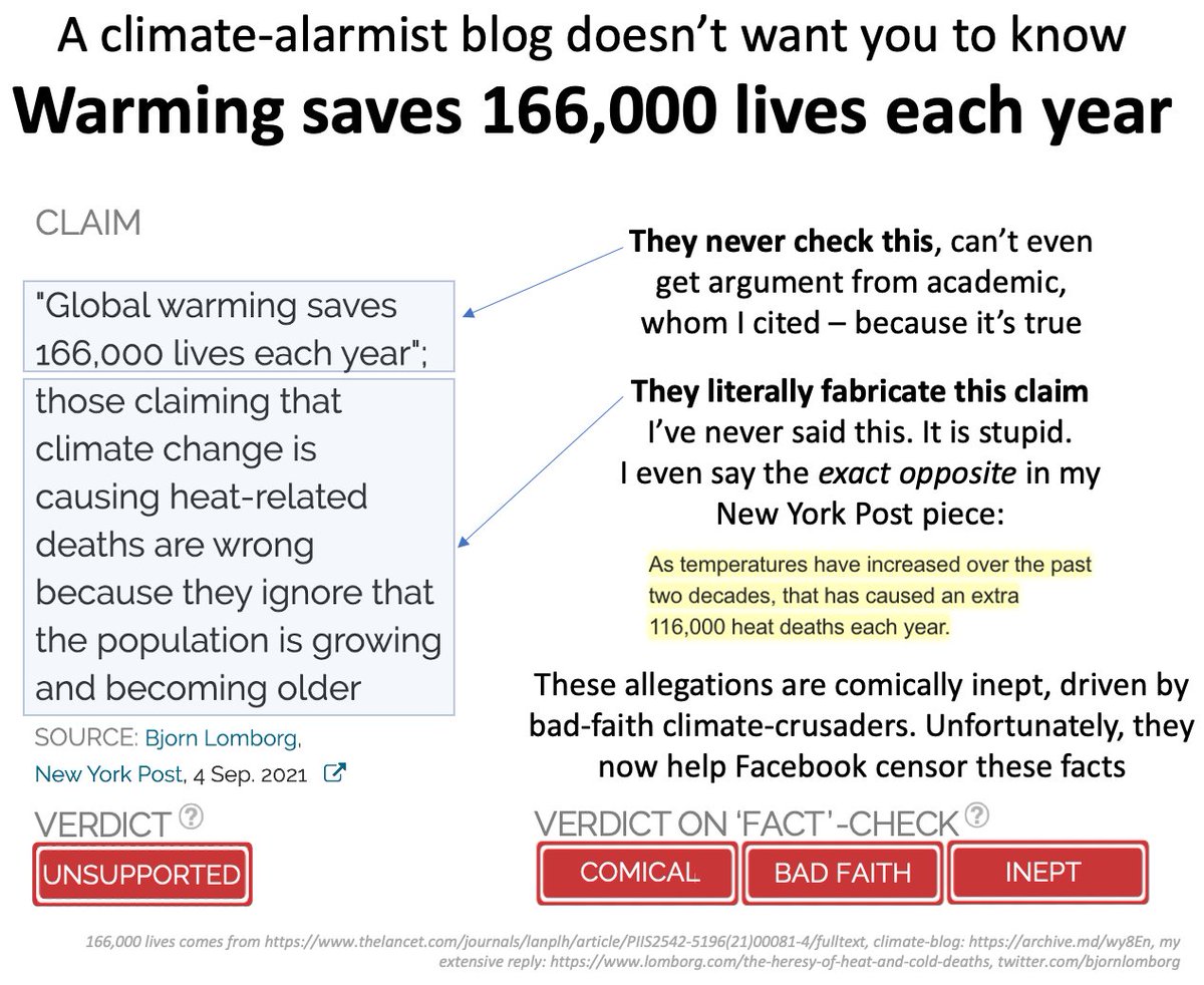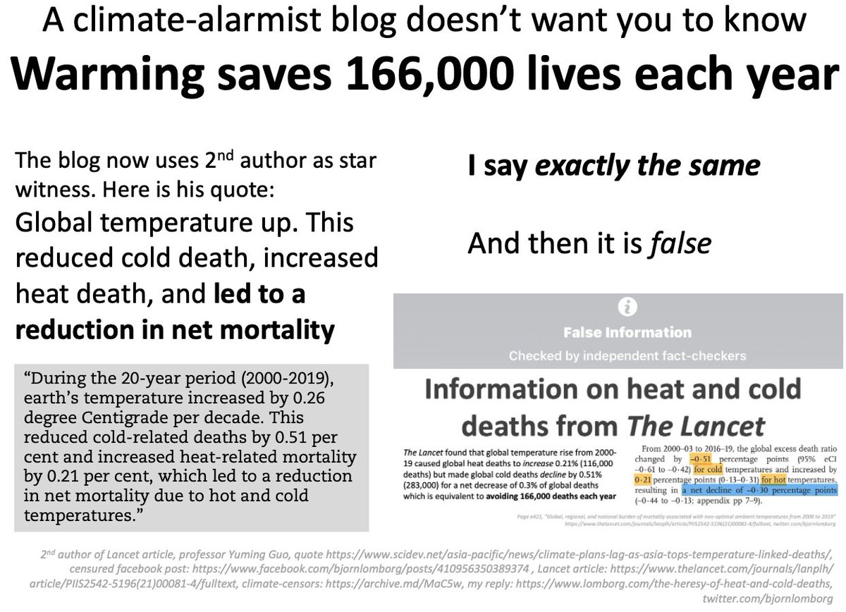 Facebook censors inconvenient facts: Temperature rise now 𝘀𝗮𝘃𝗲𝘀 𝟭𝟲𝟲,𝟬𝟬𝟬 𝗹𝗶𝘃𝗲𝘀 each year A bad-faith climate blog don't want you to hear this and use wrong and inept arguments 🧵 https://www.facebook.com/bjornlomborg/posts/410956350389374 … More info: https://lomborg.com/the-heresy-of-heat-and-cold-deaths … https://twitter.com/BjornLomborg/status/1418916412802965511 …https://twitter.com/BjornLomborg/status/1439963133683109895 …
