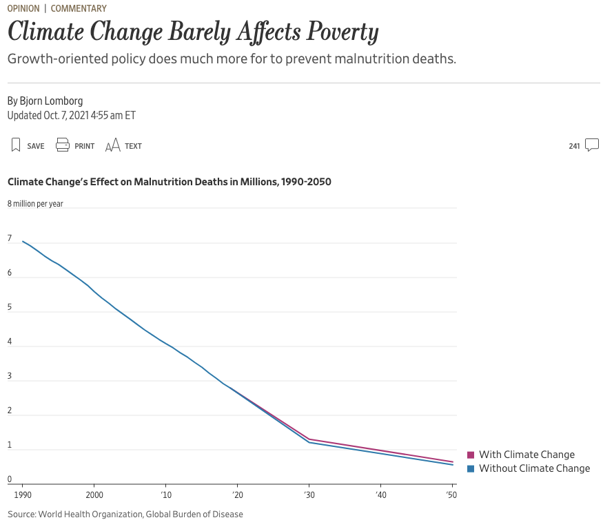 Climate deaths: Most from malnutrition That's about poverty reduction, so families can buy food Growth reduces malnutrition deaths from 7m to 300K Climate change isn’t disaster, but something that slightly slows down progress https://archive.md/3HbBl  https://www.wsj.com/articles/climate-change-malnutrition-regulation-economic-growth-glasgow-conference-11633551187 …pic.twitter.com/oU8BkDXp37